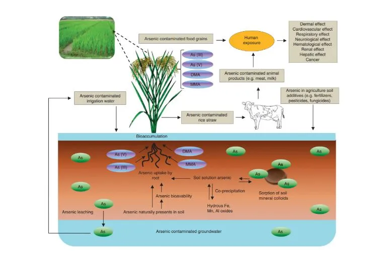 Zecchin et al. (2017) assert that numerous factors expose rice plants to arsenic. The author further states that rice plants accumulate arsenic, which naturally exists in the soil or is added through groundwater irrigation or contaminated soil additives, as seen in the figure below.